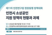 광장일보 주재영 기자 | 인천연구원은 2026년 3월 9일 오후 3시 인천광역시사회적경제지원센터 세미나실에서 “인천시 소상공인 지원 정책의 현황과 과제”라는 주제로 '제11차 현장동행 정책대화'를 개최한다. 이 행사는 어려움 속에서 변화의 시기를 맞이하고 있는 인천시 소상공인의 현황을 점검하고 지원 정책의 방향성을 논의하기 위해 마련됐다. 첫 번째 발표는 인천연구원 유근식 연구위원이 “인천시 소상공인 생태계 현황 진단”을 주제로, 두 번째 발표는 인천소상공인종합지원센터 유지원 센터장이 “인천 소상공인 지원 사업 성과 분석 및 정책 제언”을 주제로, 세 번째 발표는 중소기업중앙회 김민석 차장이 “인천 소상공인의 은퇴‧폐업 준비 현황 및 폐업 애로사항”이라는 주제로 발표한다. 이어지는 종합토론에서는 인천소공인협회 오승섭 이사장, 인천소상공인연합회 지주현 사무처장 등으로 구성된 소상공인 대표자들과 인천광역시 소상공인정책과 이상은 과장 등을 비롯한 정책관계자 간의 토론이 진행될 예정이다. 이 행사는 정책의 수요자인 소상공인과 인천시, 인천연구원, 인천소상공인종합지원센터, 인천신용보증재단, 중소기업중앙회