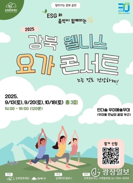 광장일보 주리아 기자 | 서울 강북문화재단은 오는 9월 13일, 20일, 10월 18일 우이동 인더숲 우이예술무대에서 ESG와 음악이 함께하는 ’강북 웰니스 요가 콘서트‘를 개최한다.