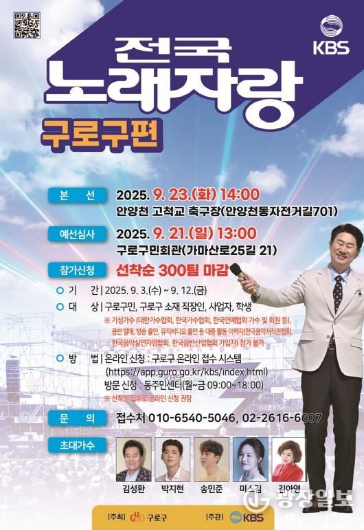 광장일보 주리아 기자 | 구로구는 KBS 장수 프로그램 ‘전국노래자랑’ 구로구편 본선을 9월 23일 안양천 고척교 축구장에서 개최한다고 밝혔다.