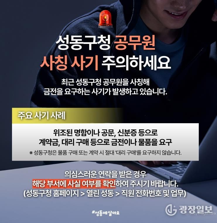광장일보 주리아 기자 | 최근 전국적으로 공공기관을 사칭한 피싱 범죄가 급증하는 가운데, 성동구는 공무원을 사칭한 범죄가 발생함에 따라 추가 피해 방지를 위해 각별한 주의가 필요하다고 밝혔다.
