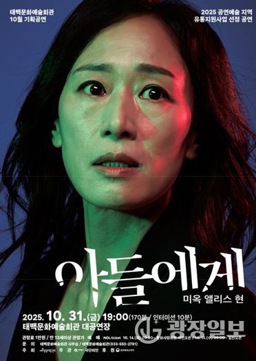 광장일보 이현나 기자 | 태백시는 태백문화예술회관 10월 기획공연으로 연극 '아들에게(부제: 미옥 앨리스 현)'을 오는 10월 31일 오후 7시, 태백문화예술회관 대공연장에서 선보인다고 밝혔다.