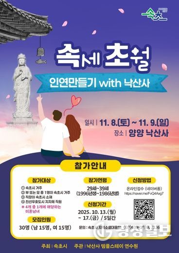 광장일보 이현나 기자 | 속초시는 11월 8일부터 9일까지 양양 낙산사 템플스테이 연수원에서 결혼 적령기 청춘남녀 만남 행사 ‘속세 초월 인연만들기 with 낙산사’를 개최한다.