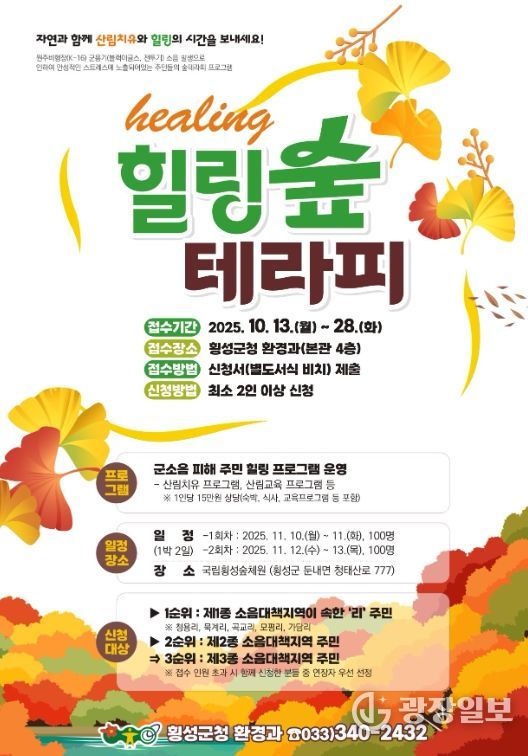 이번 주민지원사업은 국립횡성숲체원(둔내면 청태산로 777)에서 1박 2일 일정으로 진행되며, 1회차는 11월 10일부터 11일까지, 2회차는 11월 12일부터 13일까지 총 2회에 걸쳐 200명을 대상으로 힐링 프로그램을 실시할 예정이다.