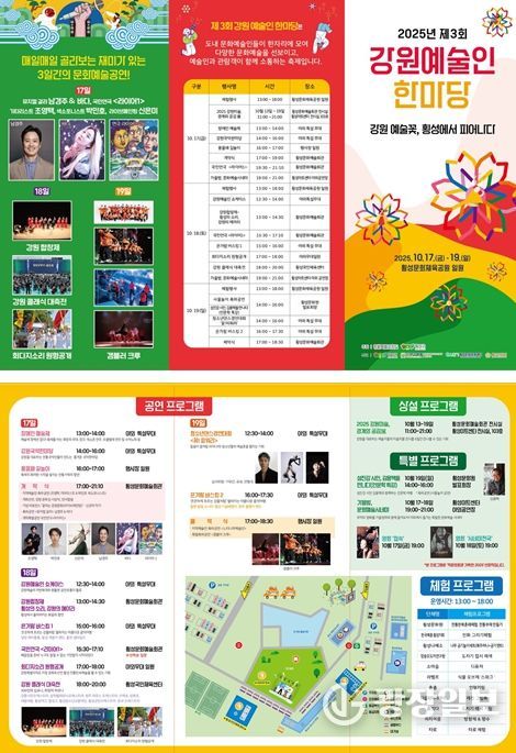 광장일보 이현나 기자 | 강원예술인과 도민의 화합·소통·공감을 위한 '2025 제3회 강원예술인 한마당' 행사가 오는 10월 17일부터 19일까지 3일간 횡성문화체육공원 일원에서 열린다.
