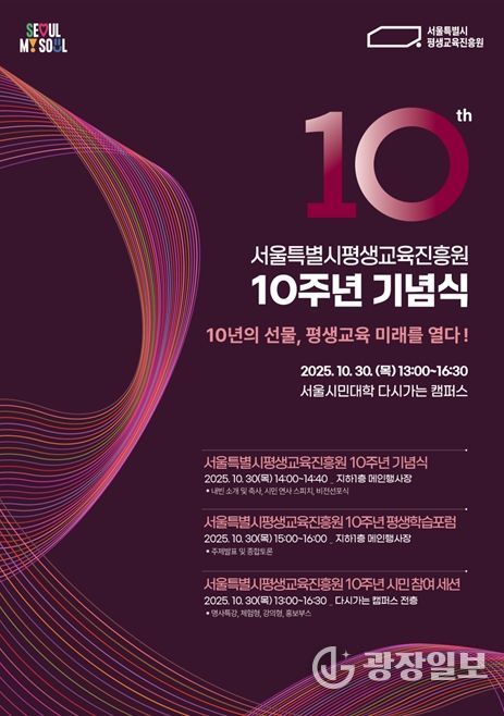 광장일보 주리아 기자 | 서울시평생교육진흥원이 설립 10주년을 맞아 오는 10월 30일 서울시민대학 다시가는 캠퍼스에서 '서울시평생교육진흥원 10주년 기념식'을 개최한다. 이번 행사는 지난 10년의 성과를 되짚고 미래 비전을 제시하는 자리를 넘어, 시민이 직접 참여하고 즐기는 다채로운 축제의 장으로 마련된다.