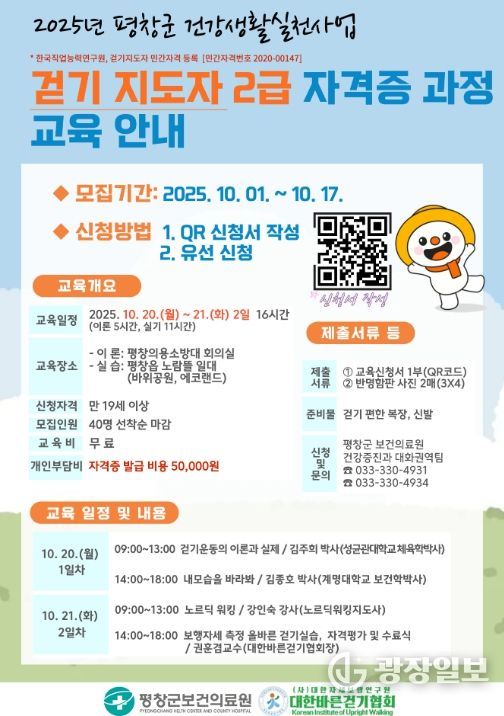 광장일보 이현나 기자 | 평창군보건의료원은 군민의 건강한 걷기 문화를 확산하기 위해 오는 10월 20일부터 21일까지 2일간 ‘걷기 지도자 2급 자격증 과정’ 교육을 운영한다.