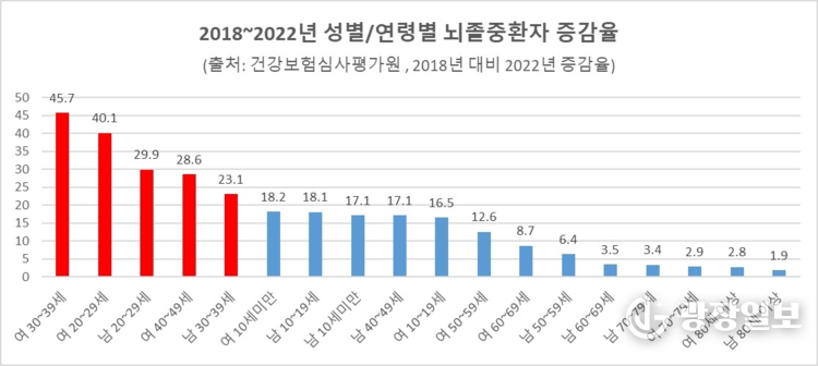 2018년 7,152명이던 30대 여성 환자는 2022년 9,363명으로 45.7% 증가했다. 이어 20대 여성은 같은 기간 2,663명에서 3,526명으로 40.1% 증가, 20대 남성은 29.9%, 40대 여성 28.6%, 30대 남성 23.1%로 뒤를 이었다. 이로써 20~30대 젊은층에서 뇌혈관질환 증가세가 두드러진 것으로 확인됐다.