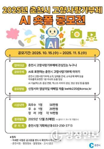 춘천시 관계자는 “빠르게 진화하는 온라인 콘텐츠 지형 변화에 발맞춰 AI 특화 공모전을 마련했다”며 “생성형 AI를 통해 상상 속 아이디어가 구현되고 더 많은 사람에게 전해지는 계기가 되길 바란다”고 말했다.