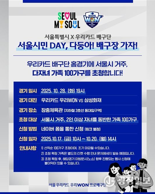 광장일보 주리아 기자 | 서울시가 ‘서울시민의 날(10월 28일)’을 맞아 28일 저녁 7시 장충체육관에서 열리는 서울시 연고 구단 ‘우리카드배구단’의 홈경기에 다자녀 100가족을 무료 초청하는 ‘서울시민 데이’를 진행한다.