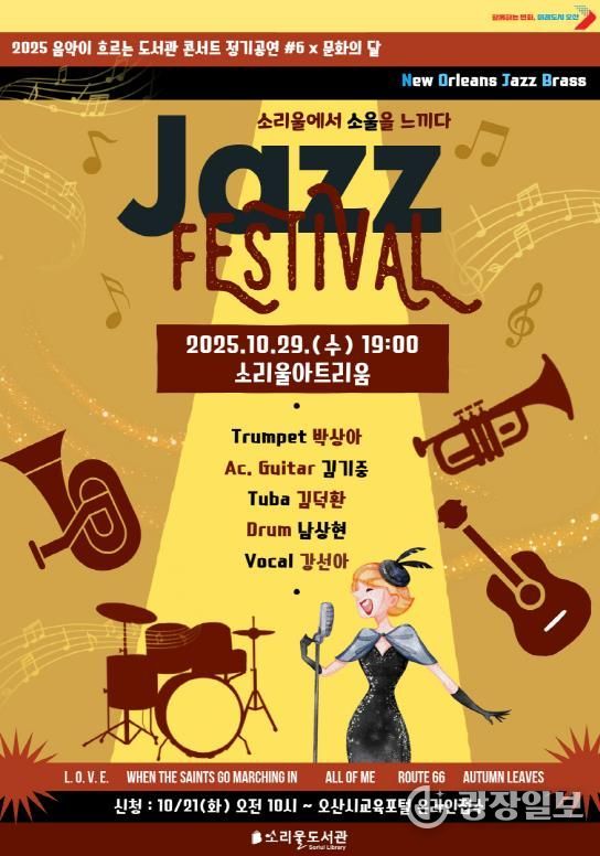 광장일보 나병석 기자 | 경기도 오산시는 오는 10월 29일 오후 7시, 소리울도서관 3층 소리울아트리움에서 '2025 음악이 흐르는 도서관 콘서트 정기공연 #6 × 문화의 달 – Jazz Festival; 소리울에서 소울을 느끼다'를 개최한다고 밝혔다.