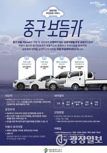 이용 대상자는 대전 중구에 주소를 둔 ▲기초생활수급자 ▲차상위계층 ▲한부모가족 ▲다문화가족 ▲북한이탈주민 가정 ▲다자녀(19세 미만 2자녀 이상) 가정이다. 대여 가능한 차량은 전기승용 1대, 경형승용 1대, 12인승 승합차 1대, 전기 1톤화물 1대 등 총 4대로 구성되어 있으며, 신청자는 별도 이용료 없이 유류비·통행료 등 차량 운행 중 발생한 실비만 부담하면 된다.