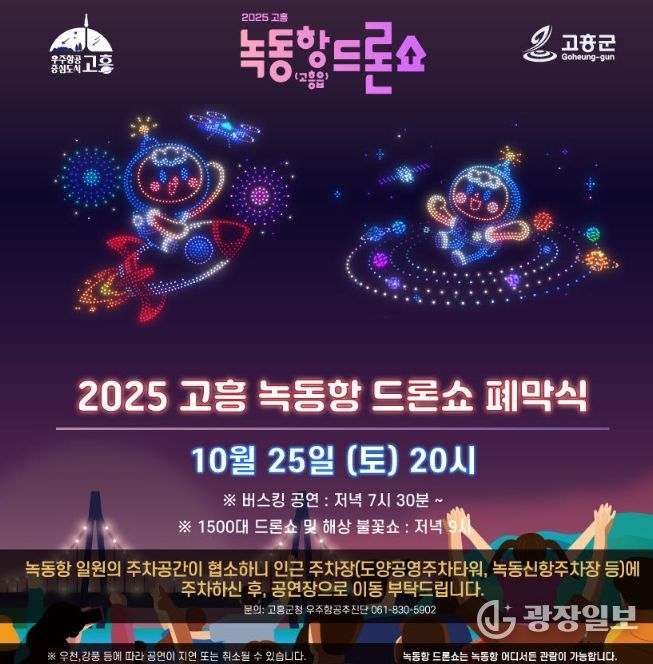 광장일보 주재영 기자 | 고흥군은 오는 10월 25일 저녁 8시, 녹동항 바다정원 일원에서 ‘2025 녹동항 드론쇼 폐막식’을 개최한다고 밝혔다.