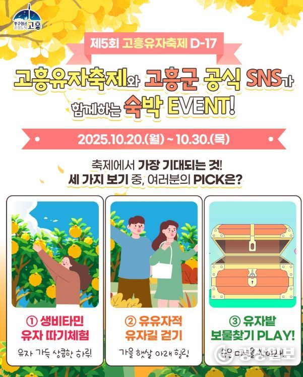 광장일보 주재영 기자 | 고흥군은 10월 20일부터 30일까지 11일간, 고흥군 공식 SNS 채널을 통해 ‘제5회 고흥유자축제 D-17! 숙박이벤트’를 진행한다고 밝혔다.