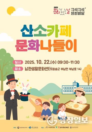 광장일보 주재영 기자 | (재)청송문화관광재단은 오는 10월 22일과 11월 25일 청송군 부남면 남관생활문화센터에서 2025 문화가 있는 날 '구석구석 문화배달' 사업의 일환으로 ‘산소카페 문화나들이’ 행사를 개최한다.
