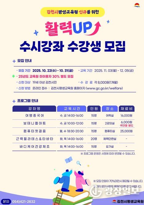 광장일보 주재영 기자 | 김천시평생교육원은 시민들의 일상에 배움의 활력을 불어넣을‘활력 UP 수시 강좌’를 개설하여, 오는 10월 22일부터 10월 31일까지 수강생 모집에 나선다.