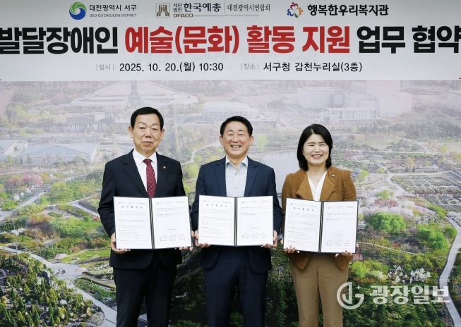 광장일보 이현나 기자 | 대전 서구는 발달장애인 문화예술 활동 지원을 위해 (사)한국예총 대전광역시연합회 및 행복한우리복지관과 3개 기관 업무협약을 체결했다고 20일 전헀다.