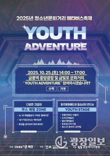 광장일보 주재영 기자 | (재)파주시청소년재단 금촌청소년문화의집은 오는 2025년 10월 25일 토요일 금릉역 중앙광 및 금빛로 문화거리 일대에서 2025년 청소년문화거리메타버스축제 ‘YOUTH ADVENTURE’를 개최한다고 밝혔다.