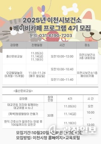 광장일보 주재영 기자 | 이천시는 임산부 및 6개월~15개월 영아의 보호자를 대상으로 10월 20일부터 ‘베이비카페 프로그램 4기’ 대상자를 선착순으로 모집 중이다. 온라인 신청(이천시청 누리집-교육포털-교육 강좌 신청)을 통해 선착순으로 접수하며 오감 발달 놀이의 경우 각 12명씩을 모집한다.