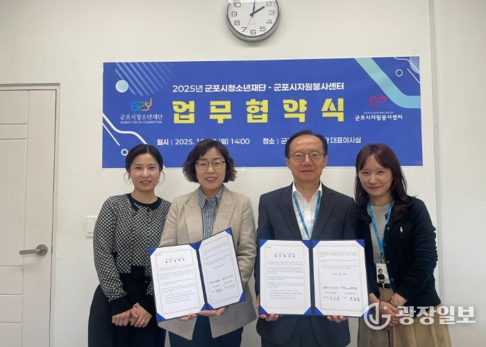 광장일보 주재영 기자 | 군포시청소년재단은 10월 20일 군포시청소년재단 대표이사실에서 군포시자원봉사센터와 지역사회 상생 및 자원봉사 활성화를 위한 업무협약을 체결했다.