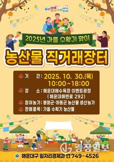 광장일보 주재영 기자 | 해운대구는 30일 오전 10시~오후 6시 해운대해수욕장 이벤트광장에서 ‘가을 수확기 맞이 농산물 직거래장터’를 연다.