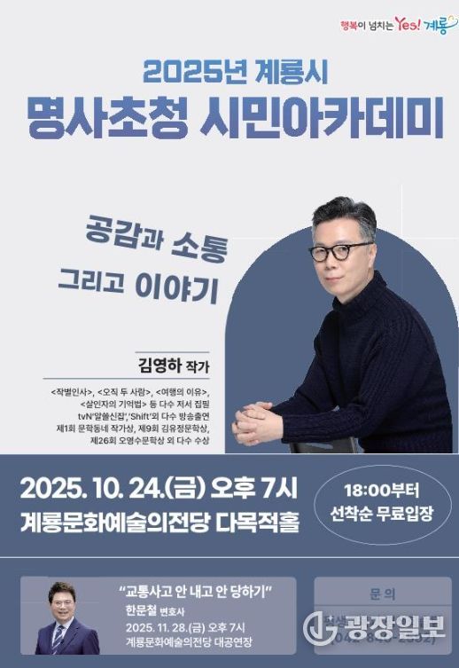 광장일보 주재영 기자 | 계룡시는 오는 24일 김영하 작가를 초청해 ‘공감과 소통 그리고 이야기’라는 주제로 명사초청 시민아카데미를 개최한다고 밝혔다.