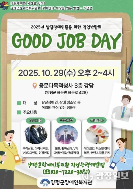 광장일보 주재영 기자 | 대한불교조계종사회복지재단이 운영하는 양평군장애인복지관은 오는 29일 오후 2시부터 4시까지 용문다목적청사 3층 강당에서 발달장애인의 직업 탐색 기회를 지원하기 위한 직업박람회 ‘GOOD JOB DAY’를 개최한다.
