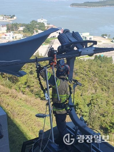 광장일보 주재영 기자 | 진도소방서는 10월 20일 명량해상케이블카 진도스테이션에서 삭도시설 민관합동 구조훈련을 실시했다. 이번 훈련은 전국적으로 노후화가 진행 중인 관광용 삭도설비와 최근 증가하는 설치 현황에 대응하기 위해 마련됐다.