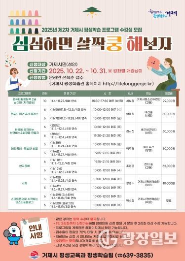 광장일보 주재영 기자 | 거제시는 오는 10월 22일부터 31일까지 ‘심쿵해(심심하면 살짝쿵 해보자)’ 평생학습 프로그램 수강생을 선착순으로 모집한다고 밝혔다.