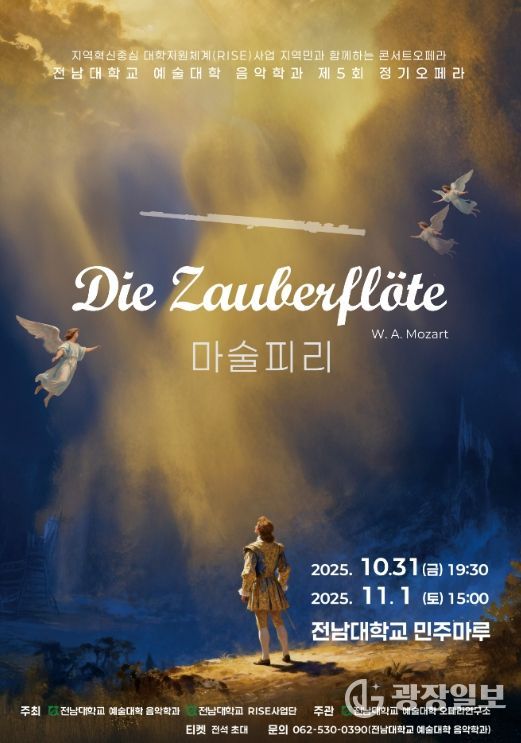 전남대 예술대학 음악학과는 오는 10월 31일 오후 7시 30분과 11월 1일 오후 3시, 전남대학교 민주마루에서 제5회 정기오페라 ‘마술피리’(Die Zauberflöte)를 무대에 올린다.