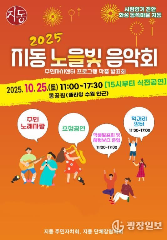 광장일보 나학천 기자 | 오는 10월 25일, 수원시 팔달구 지동 동공원(지동 267-12)에서 활력 넘치는 가을날을 아름다운 음악과 주민들의 열정으로 채울 특별한 축제, ‘2025 지동 노을빛 음악회·주민자치센터 작품발표회’가 열린다.