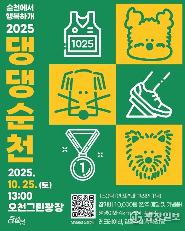 광장일보 주재영 기자 | 순천시는 오는 25일 오후 1시 오천그린광장 일원에서 반려견과 반려인이 함께 달리는 힐링 러닝축제 ‘2025 댕댕순천’을 개최한다.