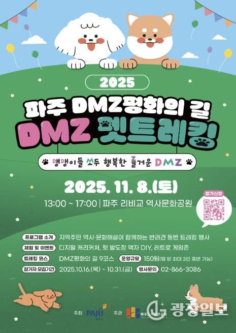 광장일보 주재영 기자 | 파주시와 파주도시관광공사는 오는 11월 8일 토요일 리비교 역사문화공원과 DMZ 평화의 길 9코스에서 ‘2025 파주 DMZ평화의 길 DMZ펫트레킹’을 개최한다고 밝혔다.