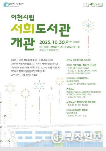광장일보 주재영 기자 | 이천시는 오는 10월 30일, 시민들의 지식과 문화 향유를 위한 새로운 공간인 ‘이천시립서희도서관’을 공식 개관한다고 밝혔다.