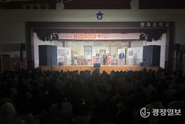 지난 10월 1일과 22일 ▲동일공업고등학교 ▲현화중학교에서 진행된 뮤지컬 '메리골드'는 옴니버스 형식으로 구성되어, 서로 다른 사연을 지닌 인물들의 이야기를 통해 청소년들이 가족과 친구, 그리고 자신의 삶을 되돌아보며 생명의 소중함과 공감의 가치를 느낄 수 있도록 기획됐다.