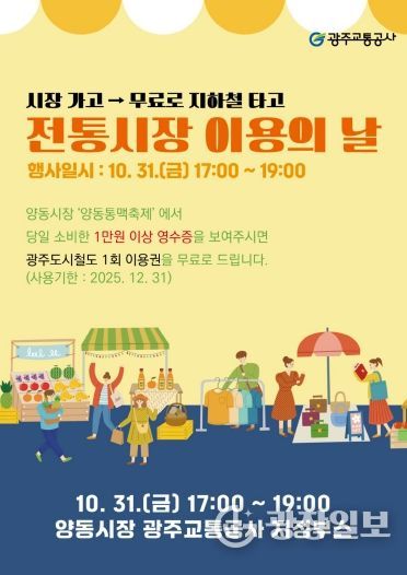 광장일보 주재영 기자 | 광주교통공사(사장 조익문)가 오는 31일 광주시 서구 양동시장에서 '10월 전통시장 이용의 날’ 행사를 펼치고, 지역 골목상권 활성화와 대중교통 이용 문화 확산에 나선다.