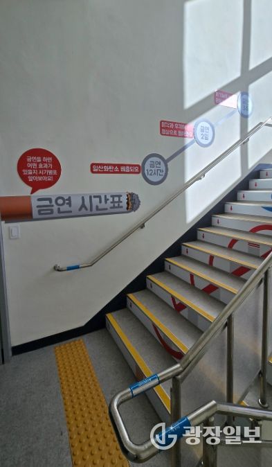 학교 주요 건물 내부 계단에 설치된 건강계단은 금연·금주를 주제로 한 문구와 이미지가 부착되어 학생들이 자연스럽게 건강 메시지를 접할 수 있도록 만들었다.