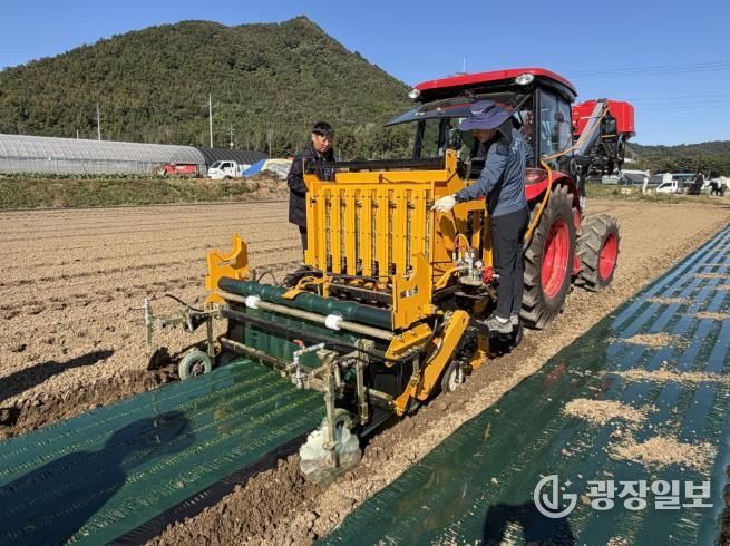 이날 연시회에서는 두둑 형성, 비닐멀칭, 파종, 농약 살포가 한 번에 가능한 마늘 복합파종기가 시연됐다.