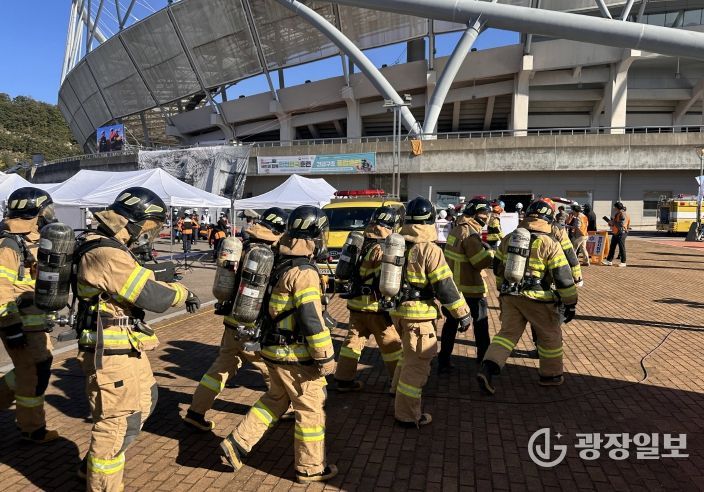 올해 훈련은 진주종합경기장에서 경기장 붕괴 및 화재로 인한 인파사고를 재난유형으로 선정해 진행됐다. 진주종합경기장 서북쪽에서 가스 누출로 화재가 발생하고 가스 저장탱크가 폭발해 경기장 일부가 붕괴돼 대피 중 다중밀집으로 인파사고가 발생한 상황을 설정했다.