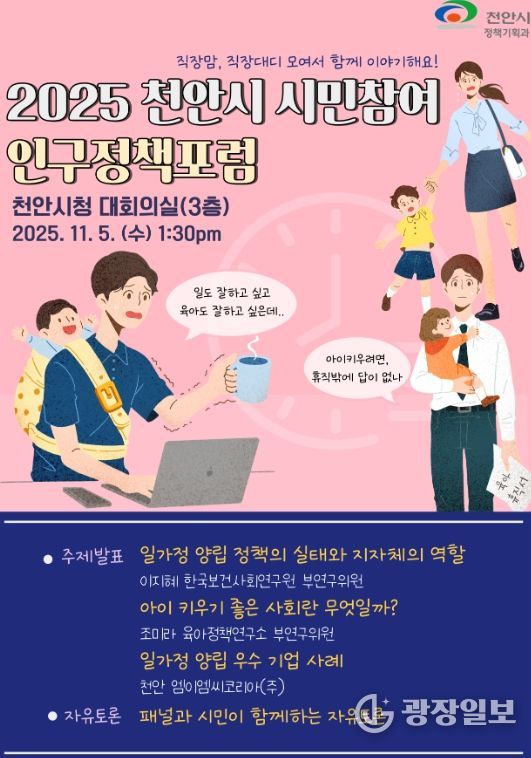 광장일보 주재영 기자 | 천안시는 다음 달 5일 시청 대회의실에서 ‘2025 천안시 시민참여 인구정책포럼’을 개최한다.
