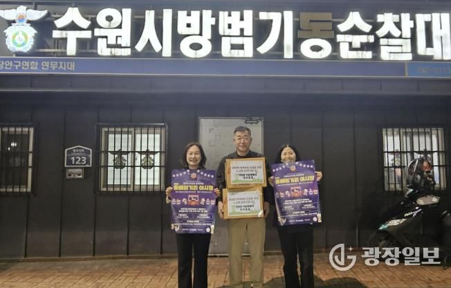광장일보 나학천 기자 | 수원시 장안구 연무동은 지난 28일 연무동 자율방범대 초소를 방문하여 대원들의 노고를 격려하고 봉사에 대한 감사의 마음을 담은 격려 물품을 전달했다.
