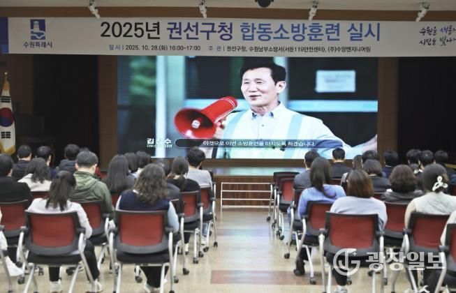 광장일보 나학천 기자 | 수원시 권선구는 지난 28일 수원남부소방서(서둔119안전센터)와 권선구 직원들과 함께 공공기관 합동소방훈련을 실시했다.