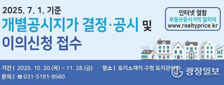 광장일보 나학천 기자 | 수원시 영통구는 2025년 7월 1일 기준 개별공시지가를 10월 30일 결정·공시하고, 11월 28일까지 이의신청 기간을 운영한다. 이번에 결정·공시되는 대상은 올해 1월 1일부터 6월 30일까지의 토지 분할, 합병, 지목변경 등 변동 사항이 있는 58필지이다.