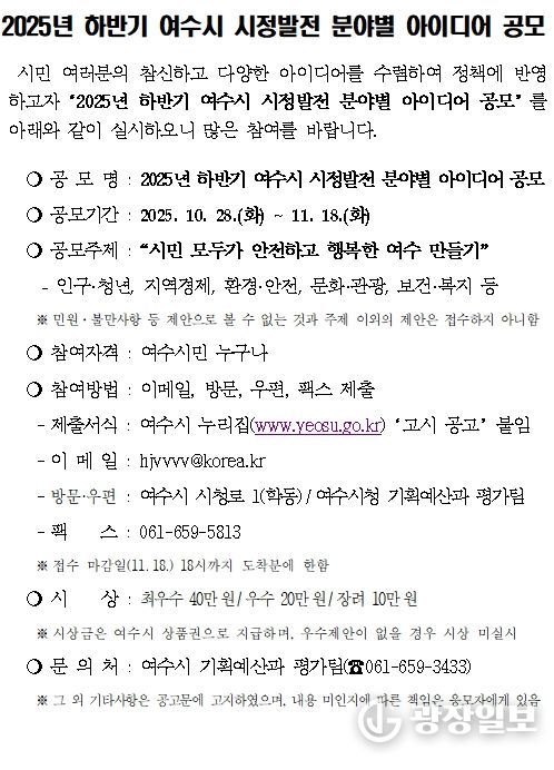 광장일보 주재영 기자 | 여수시는 시민의 창의적인 제안을 수렴해 정책에 반영하기 위해 오는 11월 18일까지 ‘2025년 하반기 시정발전 분야별 아이디어 공모’를 진행하고 있다.