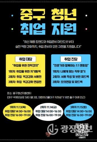 광장일보 주재영 기자 | 대구 중구청년지원센터는 11월 13일부터 15일까지 중구청년지원센터 ‘잇플’에서 ‘중구 청년 취업지원 프로그램’을 개최한다.