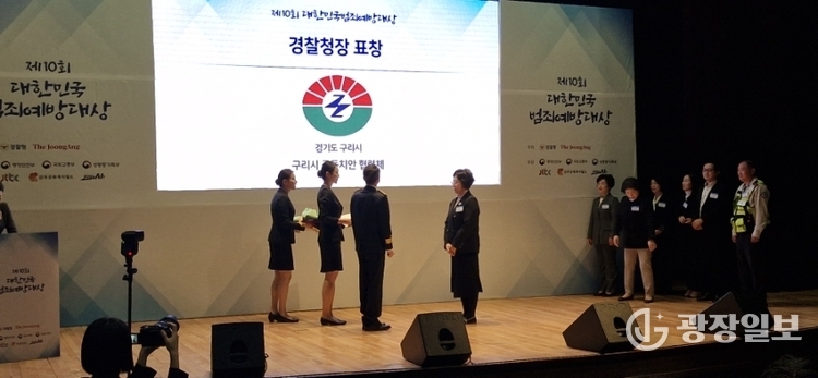 구리시= 주재영 기자 |구리시(시장 백경현)가 지난 10월 28일 서울 마포구 중앙일보 사옥에서 열린 ‘제10회 대한민국 범죄예방 대상’ 시상식에서 공동체 치안 부문 경찰청장상을 수상했다.