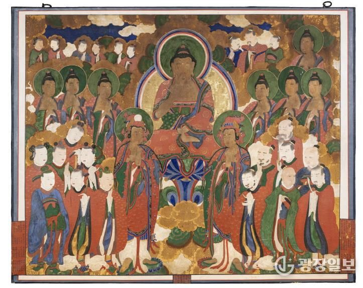 광장일보 나학천 기자 | 수원 봉녕사 소장 불화 ‘수원 봉녕사 석가여래회도’와 ‘수원 봉녕사 치성광여래회도’가 2점이 미술사적·학술적 가치를 인정받아 지난 20일 경기도 유형문화유산으로 지정됐다. 조선 후기 불교회화의 지역적 교류 양상과 예술적 특징을 잘 보여주는 작품이다.