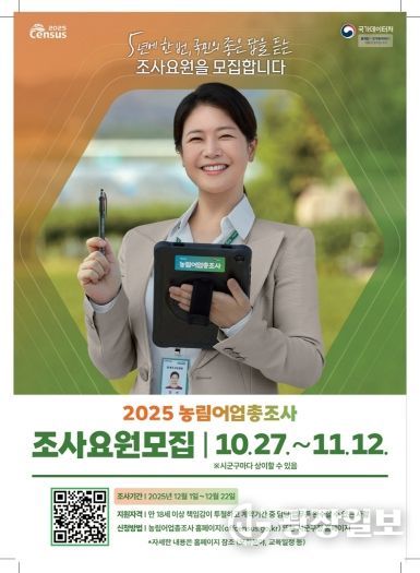 모집 대상은 만 18세 이상으로, 스마트기기 활용이 가능하고 통계조사에 성실히 임할 수 있는 자면 누구나 지원할 수 있다. 지원은 창녕군 대표 누리집 또는 농림어업총조사 누리집을 통해 가능하며, 최종 합격자는 11월 14일 공지된다.