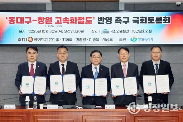광장일보 주재영 기자 | 창원특례시는 30일 국회의원회관에서 ‘동대구–창원–가덕도신공항 고속화철도’의 제5차 국가철도망 구축계획 반영을 위해 추진 중인 범시민 서명운동(10.17.~11.16.)과 연계해, 사업 추진에 대한 공감대 확산을 위해 ‘동대구–창원 고속화철도 반영 촉구 국회토론회’를 개최했다.