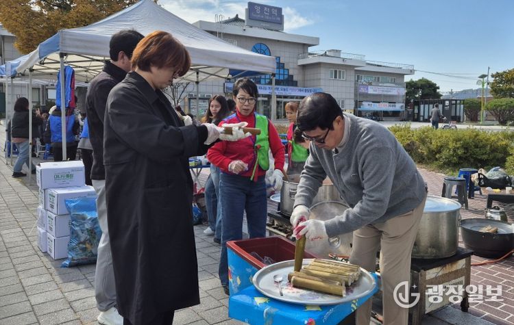 이날 봉사에는 단원 10여 명이 참여해 이른 아침부터 정성껏 준비한 소고기국, 대통밥, 김치 등으로 따뜻한 한 끼 식사를 차렸으며, 시민 100여 명에 대접해 큰 호응을 얻었다.