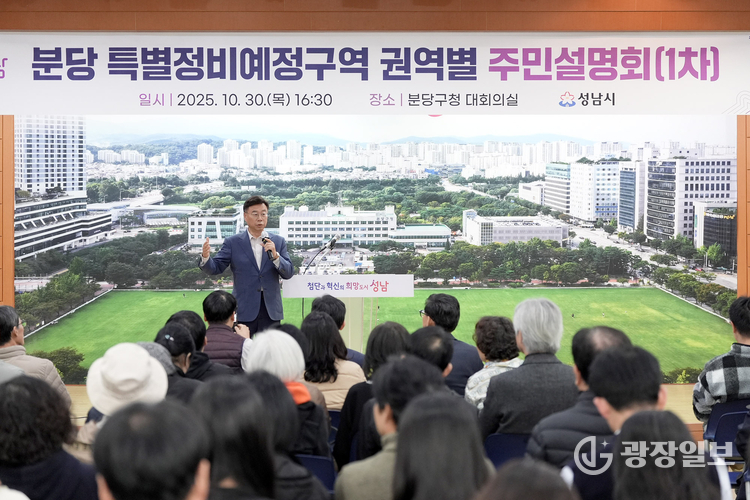 성남시= 주재영 기자 |성남시(시장 신상진)는 분당 신도시 정비사업의 원활한 추진과 주민과의 소통 강화를 위해 오는 11월 7일(금) 오후 3시, 분당구청 대회의실에서 *‘분당 특별정비예정구역 2차 권역별 주민설명회’*를 연다.
